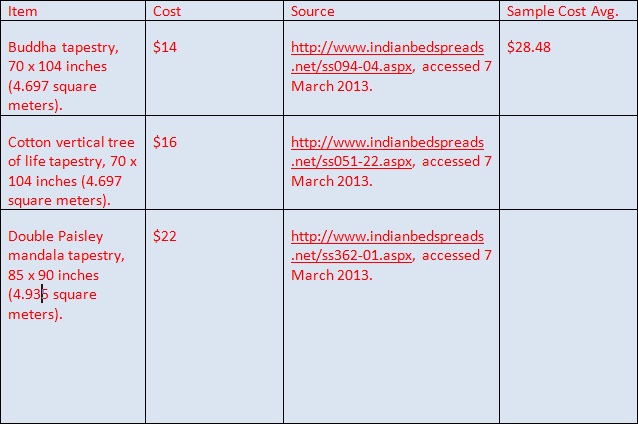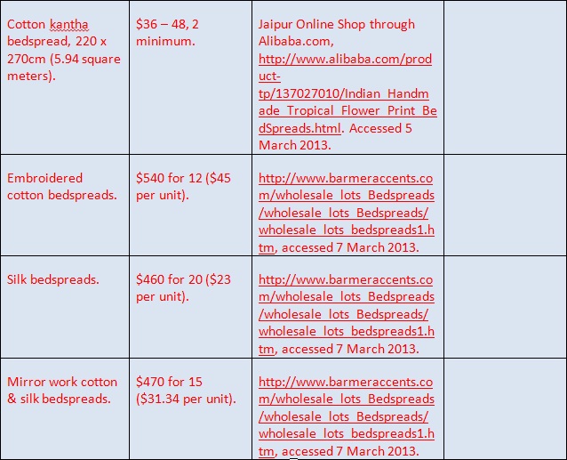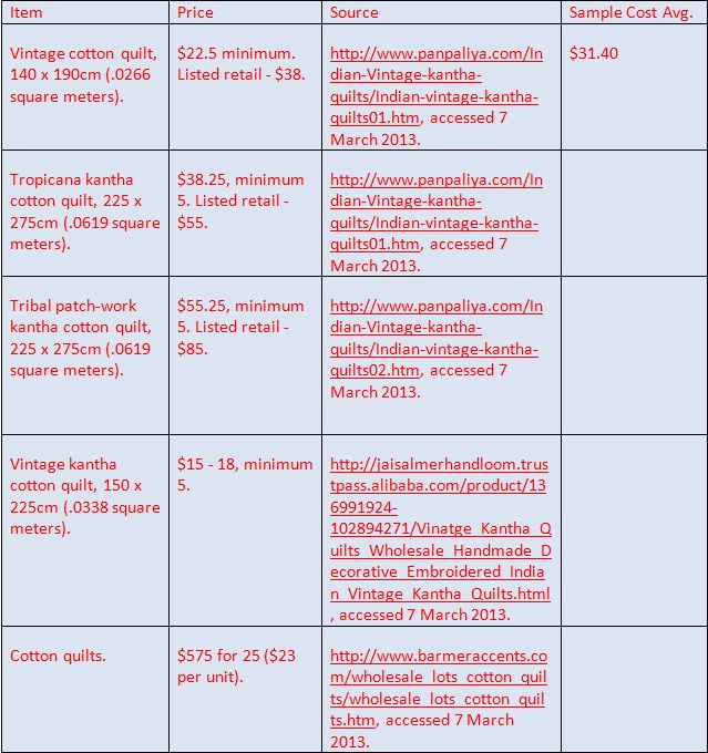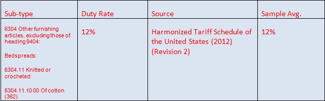 Bedspreads - $30 acquisition, $54 retail, (.0127 meter height) * (5 meters squared) = .0635 meters cubed. 12% duty rate.