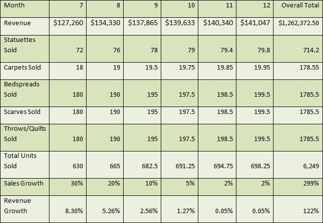 For now, the product mix comes down to guessing what demand will be like, such as assuming more expensive products will not sell as highly. However, some products must be purchased in lots of minimum order quantities, and we assume the highest available statistic for this. We also assume that growth will increase after a large initial outlay of advertising spending, and then stabilize, but otherwise we are guessing at what the growth rate could be for now.