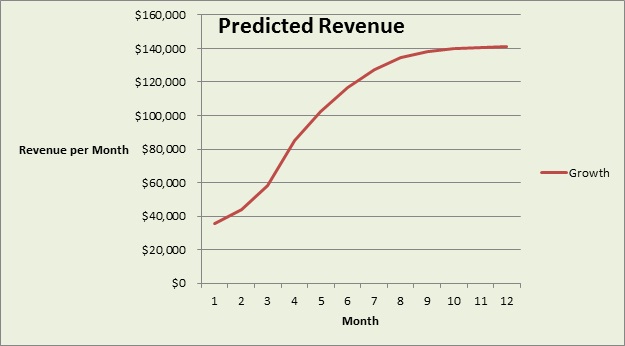 The model follows an NPV equation, (number of products * price + number * growth rate + previous growth rate)). The beginning case does not involve any growth, and the second case does not involve previous growth. For each month, the equation for each product is added together. We take an educated guess at how many of each product might sell per month, and the growth rate for future months, with respect to all previous growth. However, it generally models logistic growth, with high growth in the beginning, until growth approaches the 2% level with relatively consistent monthly revenues. A logistic function can also do this if set up in the correct way.