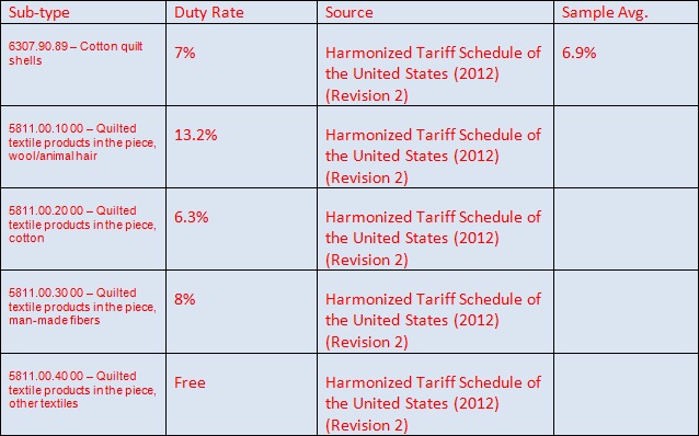 Throws/quilts - $35 acquisition, $63 retail. (.0127 meter height) * (.05 square meters) = .000635 cubic meters. 8% duty rate.