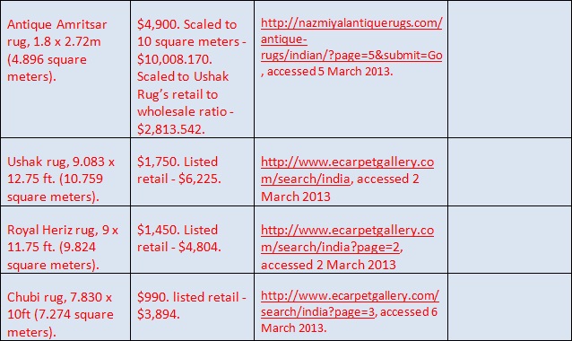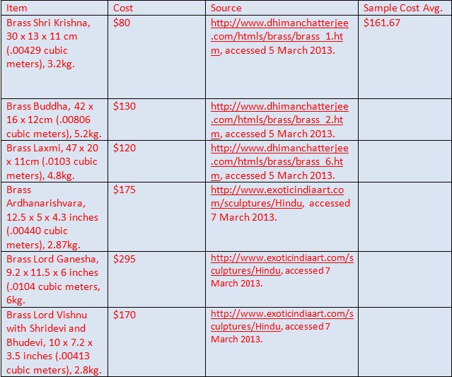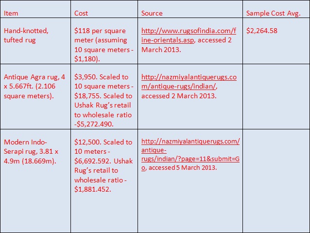 We are guessing at what retail price we could sell certain products. However, for carpets, we know they could sell for about $6,000, so we will underestimate that we could sell our carpets for $4,500 each, with an average cost of carpets sold at $2,500 (overestimating) for the cost formula. We’ll assume a 3.5% duty rate, even though the carpets would most likely be duty-free. For any item we’ll assume a shipping cost of $50 per cubic meter.