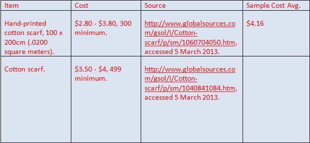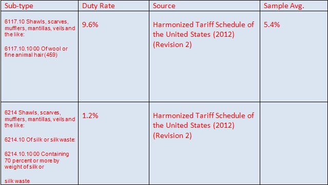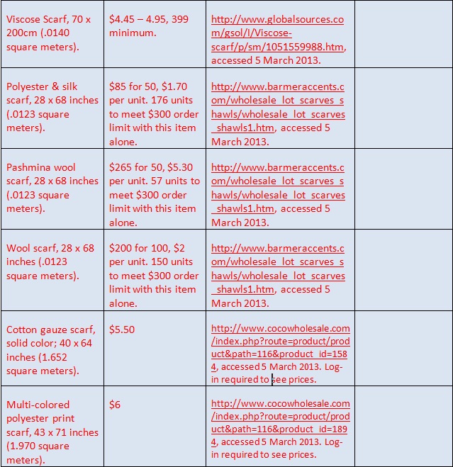 We’ll assume a similar cost of goods sold vs. price ratio for scarves, overestimating at $33 to purchase a scarf. Therefore, we have $60 retail. Assumed average volume = (.0127 meter height) * (.0200 meters squared) = .000254 meters cubed. 9.6% duty rate because of probable non-silk composition.