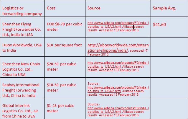 The shipping section does not reflect exact routes from a city in India to Seattle, but provides an idea of shipping costs per cubic meter in a general fashion. The maximum shipping cost provided by each company is used.