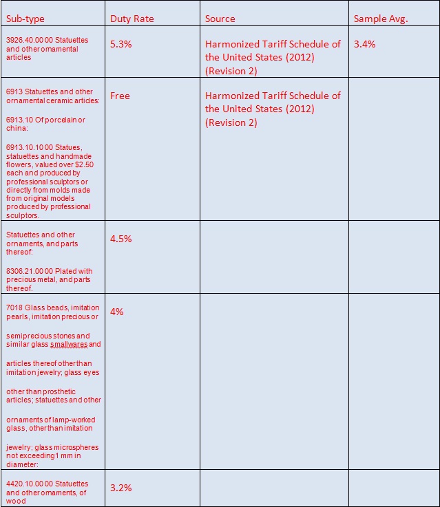 Statuettes - $200 acquisition, $360 retail, .0100 cubic meters. 4.5% duty rate, assuming metal composition.