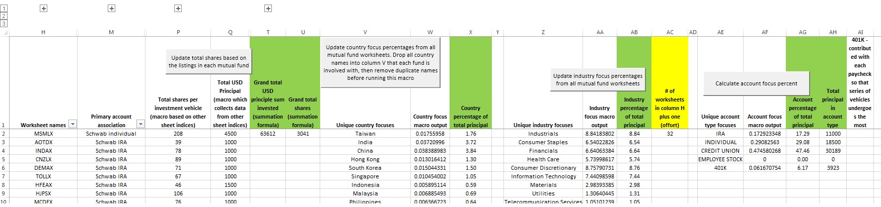 Macros to record investments by fund or stock symbol, and to tabulate the data