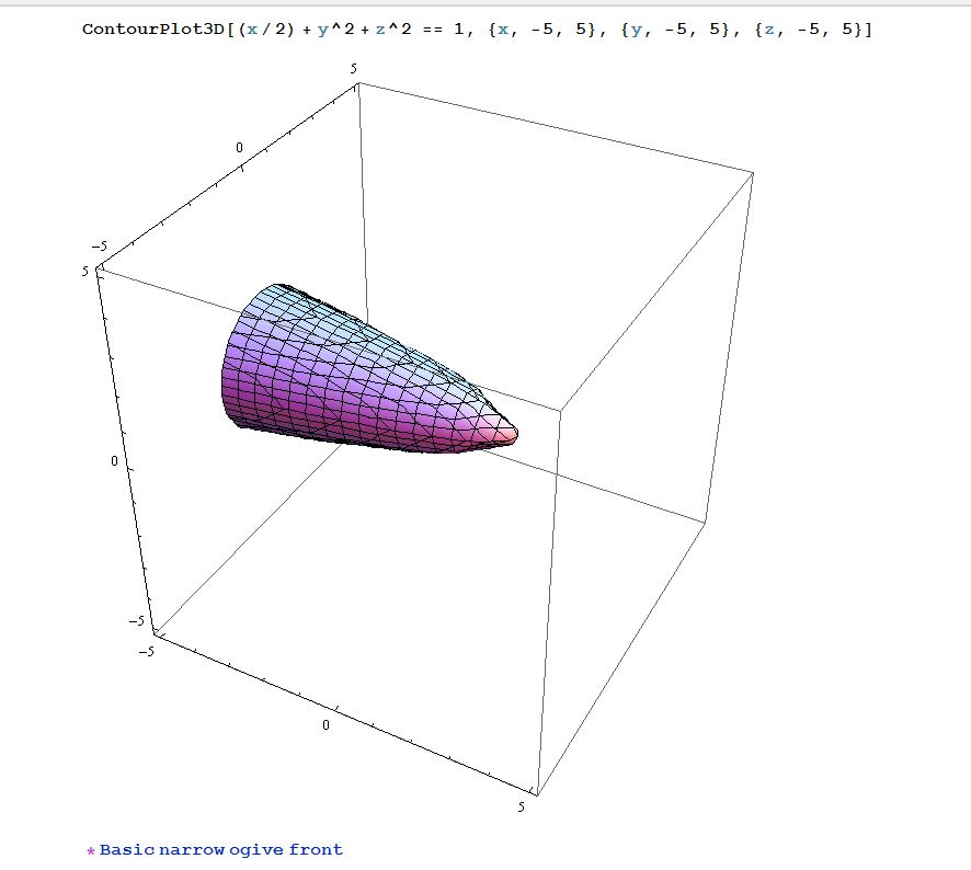 The parabolic nose concept I envisioned in Mathematica, terminating roughly in an ellipse, was eventually made to terminate into separate conics rather than one ellipse, corresponding to a matching number of splines at the tail. This allowed the surface cover generation for the middle of the drone to be relatively straight across the Y-axis (length), with a smooth curvature transition in the other directions.