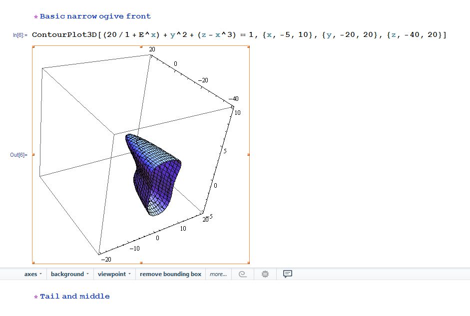 Modeling this cone and tail out in ViaCAD, I started by laying out the wireframe using profile screenshots. This has been a big change to how I once created models using solid primitives in ZModeler 1 for video game modifications. In this case because of the complexity of the wireframes, I used surface covers. Because this model frequently involved curvatures in all three dimensions, and ViaCAD's surface cover algorithm attempts to account for them with multiple straight-edged, overlapping meshes, which then didn't always smoothly reconcile in the same way as Mathematica's formula-based generation, sometimes I did not utilize a particular spline. Then this mostly limited a complex shape, such as the tail, to a complex curvature in two of the three two-dimensional directions.