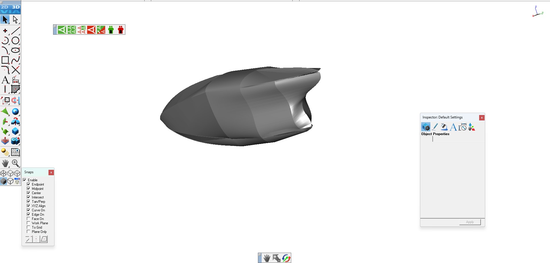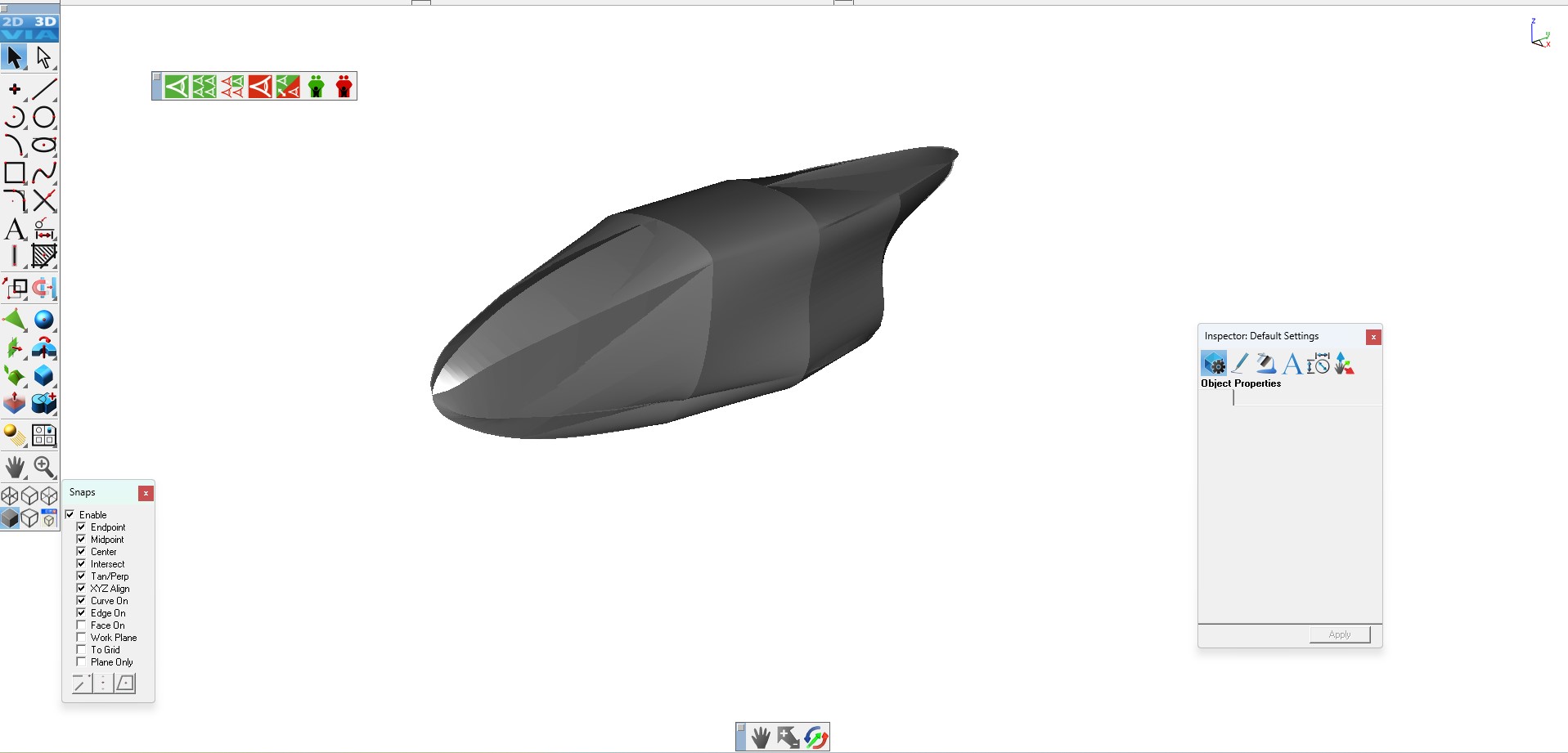 This iteration is an attempt at envisioning the requirements for a relatively small (camera payload) exploratory drone for undersea use. The simple ogive (bullet-shaped) nose as the initial conception for the front is to mimic the same contour as airplane noses, pending material choice and testing (smooth flow through a fluid with minimal drag). The nose in this context would need to be a transparent material for a spherical camera and that is where in practice joining different materials together (main body versus transparent front) becomes most critical to prevent failure under pressure. The rear is a parabolic side profile terminating in a logistc curve-shaped tail to mimick the tail of surface ships; an intent to maximally vent flow through the back at minimal drag as the vessel propels forward.