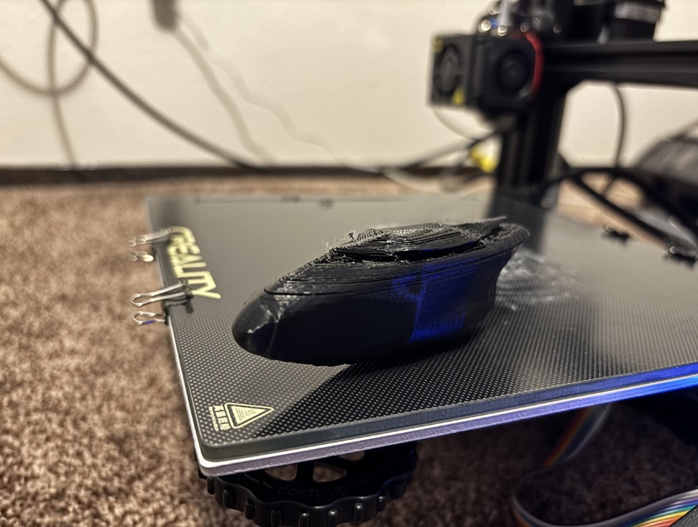 After finding a working setup with the Creality Ender 1 machine (dry glue on a glass bed), where the model processed properly in Creality's slicing software, I printed a test copy in PLA (polylactic acid). This turned out to be too top-heavy to properly float. The next iteration involved halving the maximum height to roughly match the maximum width of the body. This floated but not in the direction I expected. The third image is the orientation in which it floated in shallow water.