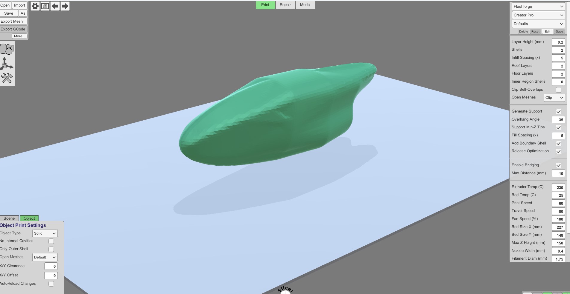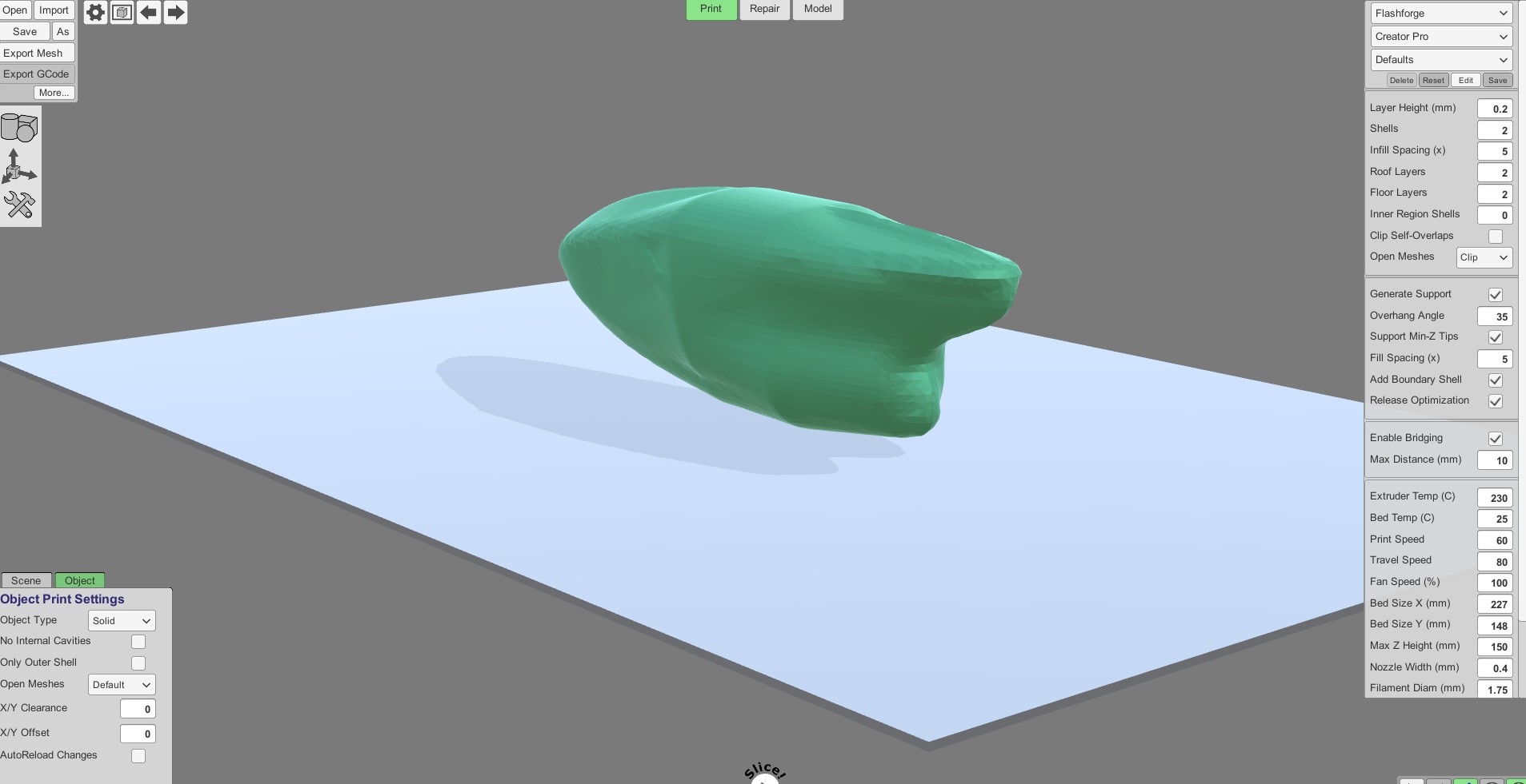 Then I exported as STL format and repaired with Cotangent. I ended up doing an edge connection repair, followed by auto repair to entirely make sure the mesh had no holes, and finally conversion to a morphology in order for the complex curvatures to be converted into a solid properly (not as smooth of a curvature in some places as I expected). Then that allowed proper slicing for 3D printing gcode generation.